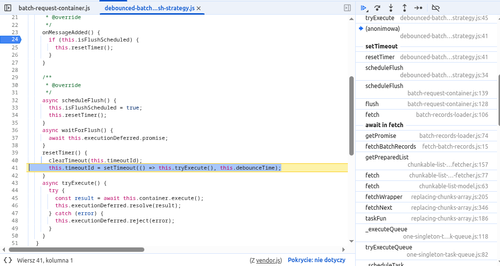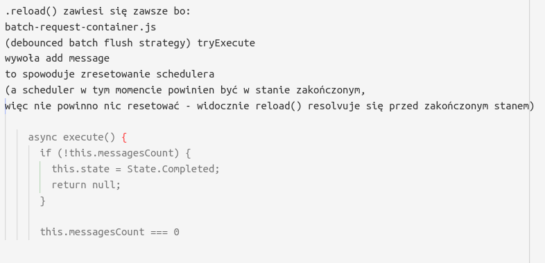 Wywołując listModel.list.reload() w jakimś list modelu z awaitem wykona się reloadowanie wszystkich rekordów. Jeśli zaraz po tym w kodzie dopisze się: list.toArray()[0].reload(), czyli reload jakiegoś rekordu z tej listy, to system batchowy frontendu się zawiesi w nieskończoność.